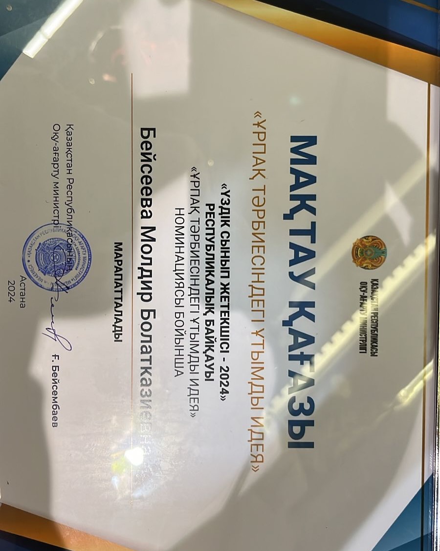 Аталған сынып жетекшіміз Шымкент қаласы бойынша өткізілген “ҮЗДІК СЫНЫП ЖЕТЕКШІ-2024” байқауында 1 орын иегері атанған болатын.